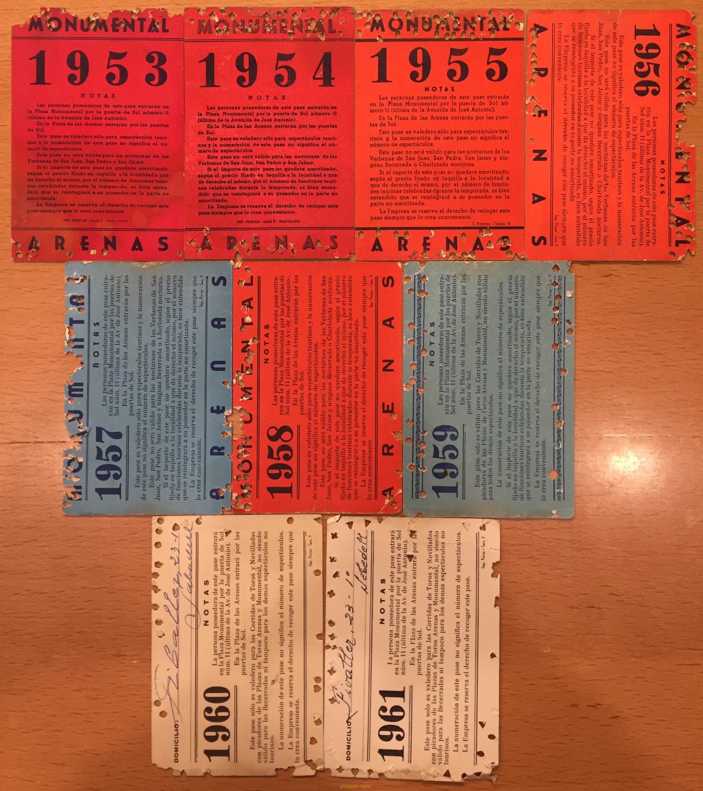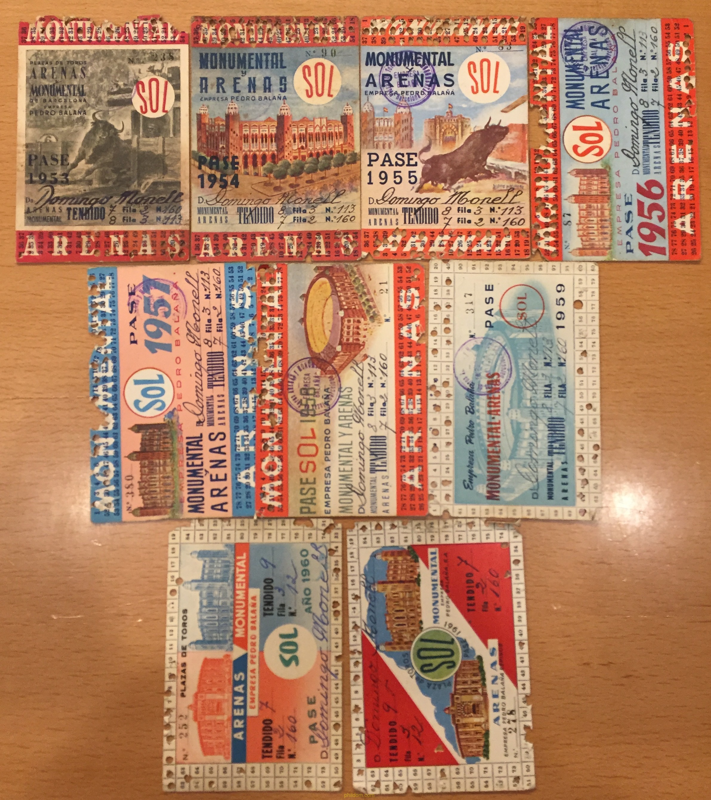 PASE TEMPORADA PLAZA DE TOROS MONUMENTAL. 1953 1954 1955 1956 1957 1958 1959 1960 1961