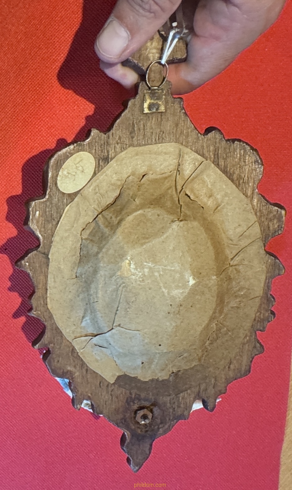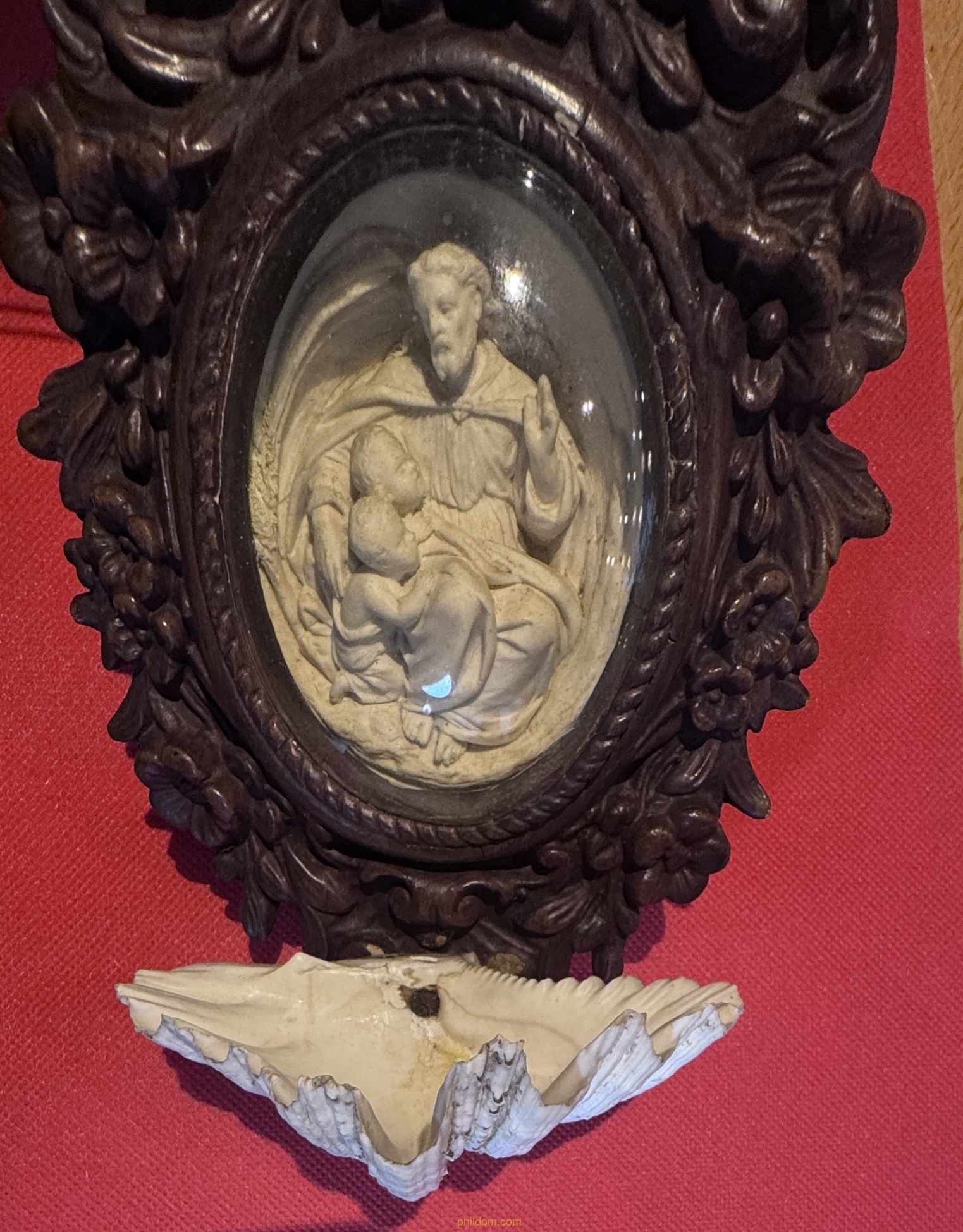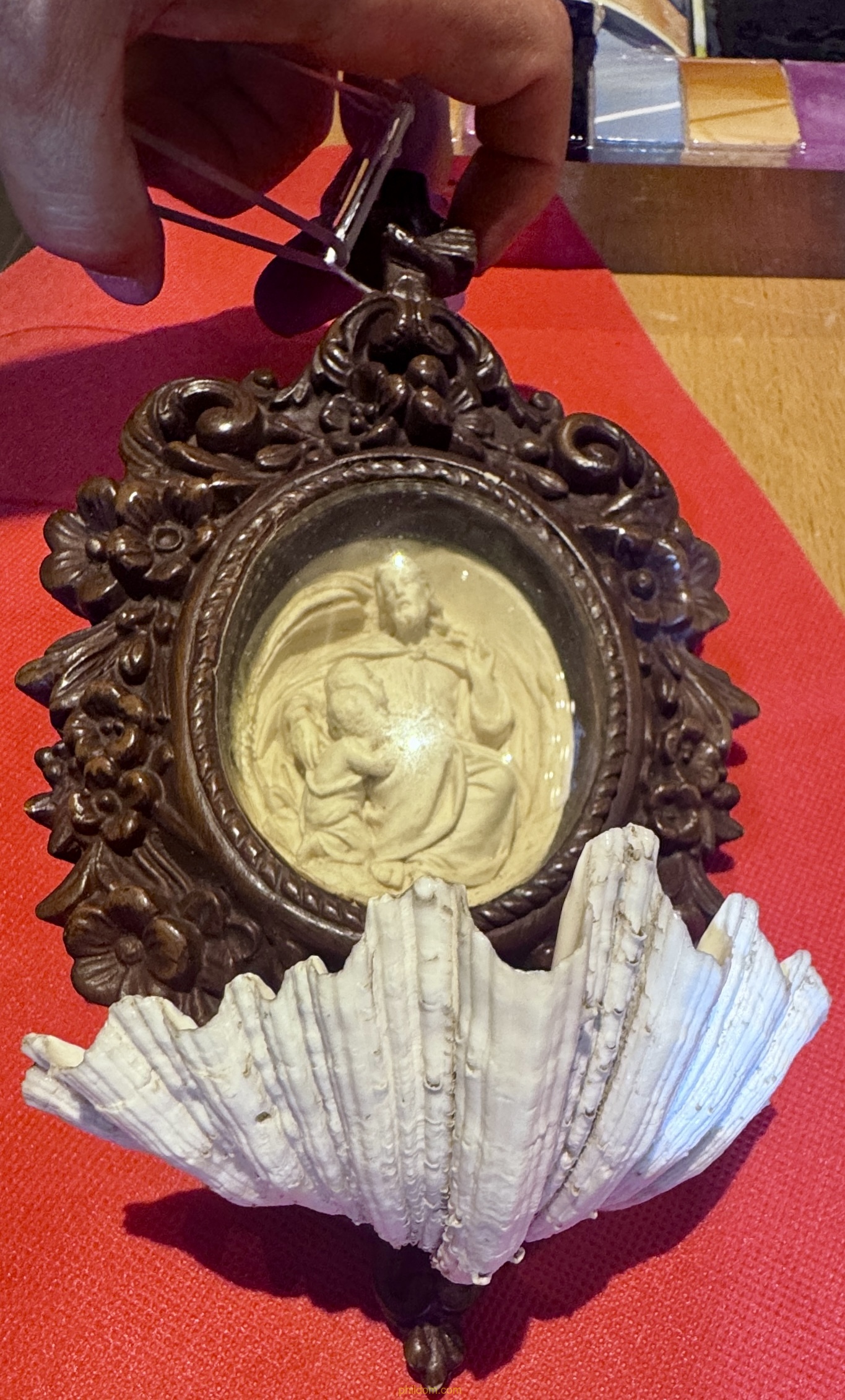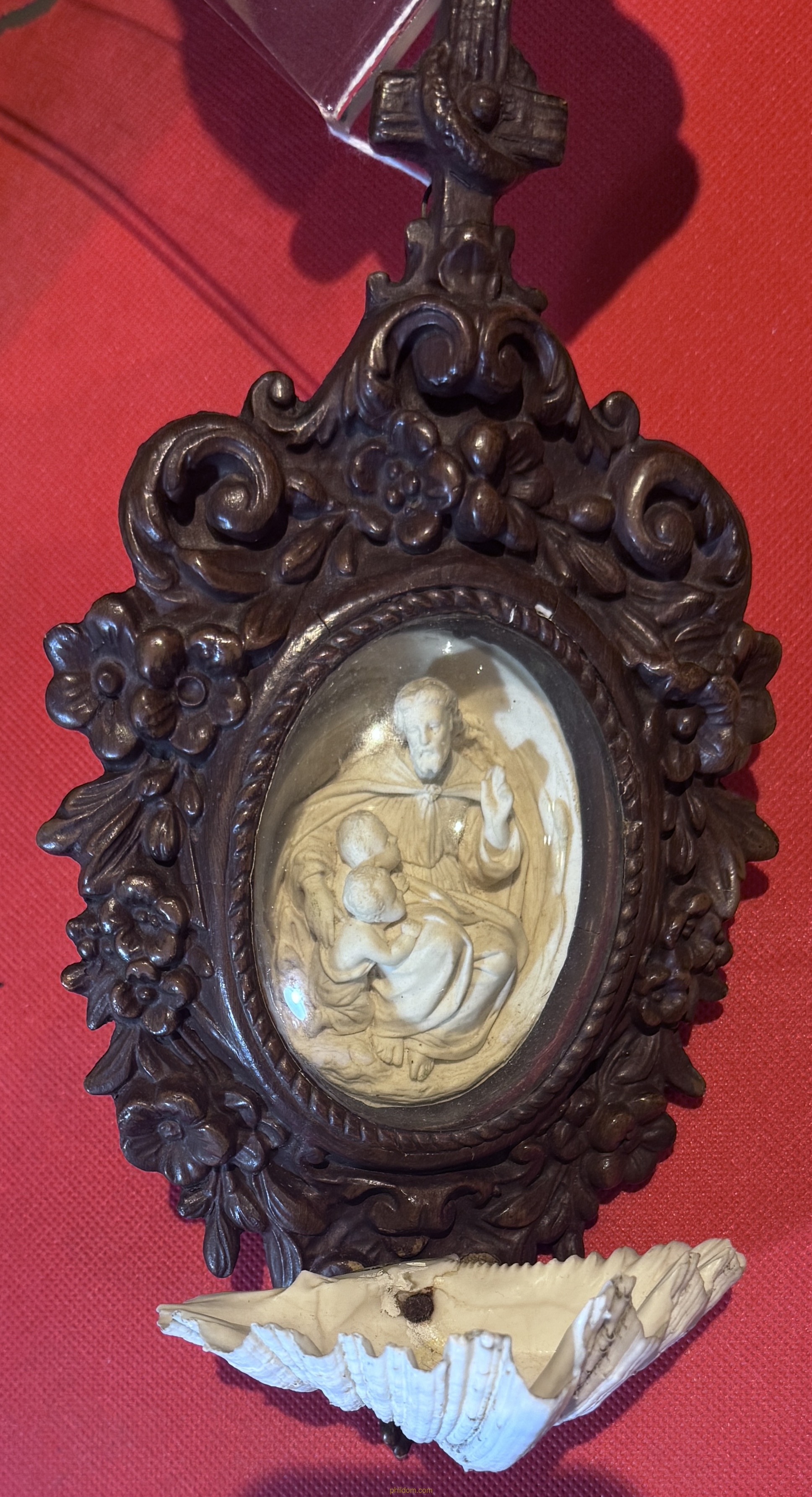 ANTIGUA BENDITERA MADERA Y CONCHA. IMAGEN DE JESÚS CON NIÑOS